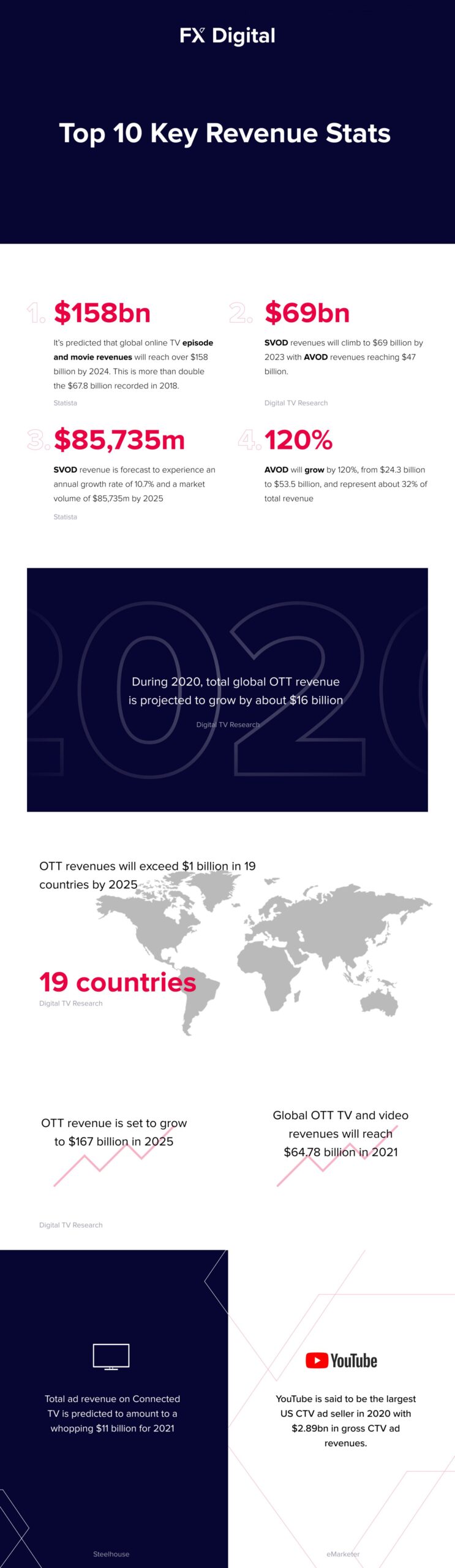 Within the OTT and Connected TV space, there are revenue forecasts and predictions that are set to exceed expectations, with the pandemic helping to fuel this growth. Below are some key statistics focused on revenue within this space and predictions as to the value of this space in time.
