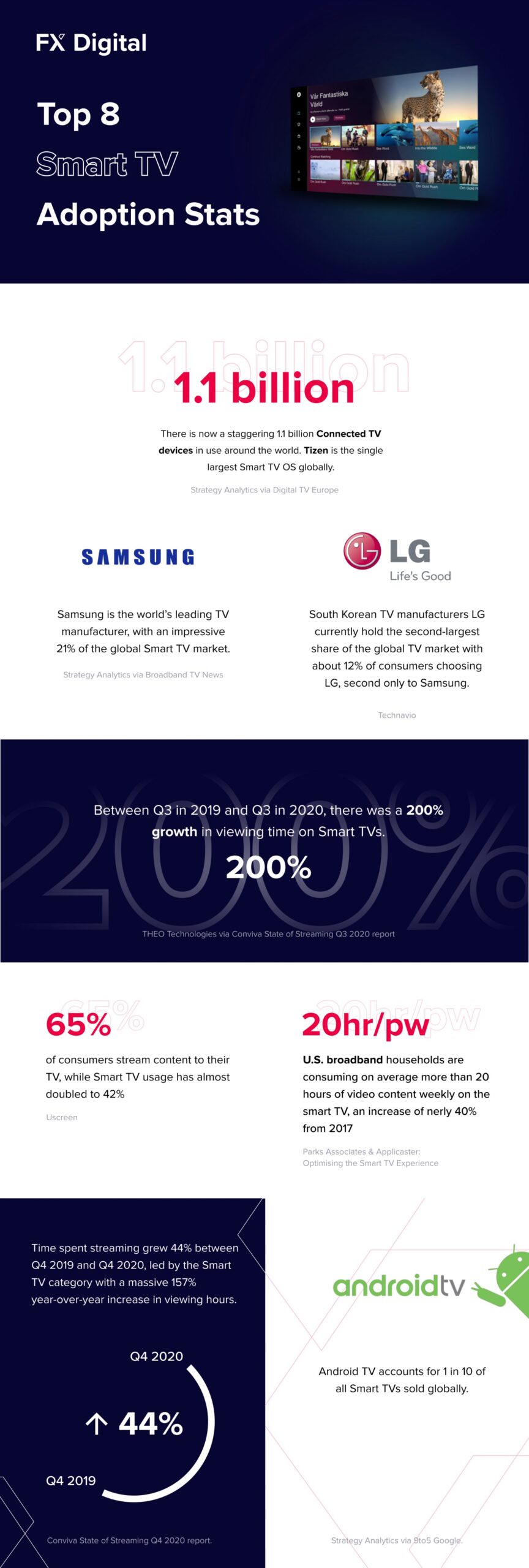 - Between Q3 in 2019 and Q3 in 2020, there was a 200% growth in viewing time on Smart TVs (THEO Technologies via Conviva State of Streaming Q3 2020 report)