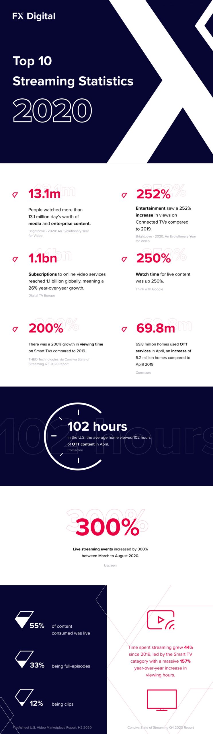 - Entertainment saw a 252% increase in views on Connected TVs in 2020 compared to 2019 (Brightcove – 2020: An Evolutionary Year for Video)