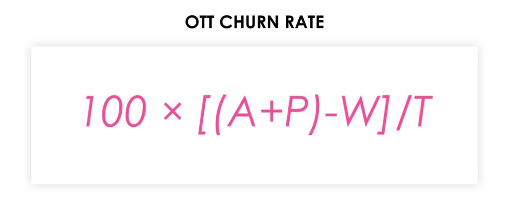 Once you have established all of the above variables for any given period, you can now calculate the net churn rate using the OTT churn rate formula: 100 x [(A+P) – W] / T
