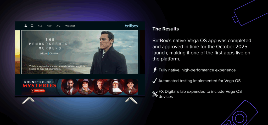 BritBox’s presence on Vega OS from launch day reinforced its position as a leading international streaming platform, ready to reach audiences across new Amazon ecosystems. For FX Digital, the project marked another successful delivery in partnership with BritBox and highlighted our ability to innovate under pressure, adapt to emerging technologies, and deliver premium applications across an expanding landscape of connected TV platforms.