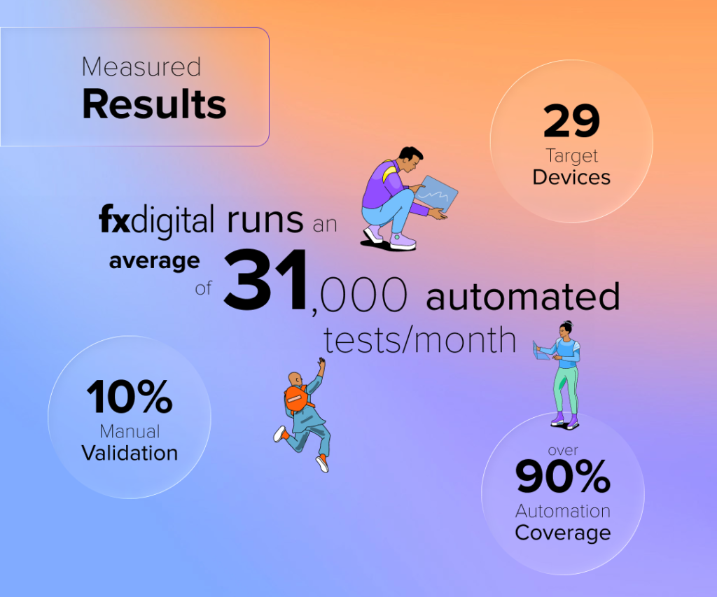 For Odido, The FX Digital London test automation lab now runs over 31,000 automated tests per release across 33 target devices, achieving around 90% automation coverage. The remaining consists of complex scenarios better suited to manual validation.